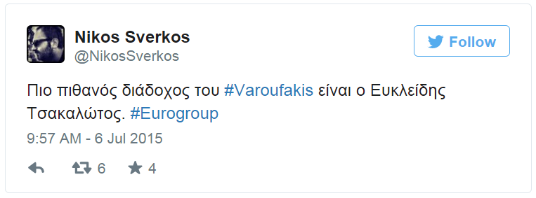 Θυμίζουμε ότι νωρίτερα ο Γιάνης Βαρουφάκης ανακοίνωσε την απόφασή του να παραιτηθεί από τη θέση του υπουργού Οικονομικών, αφήνοντας σαφείς αιχμές ότι η αποχώρησή του έγινε κατόπιν απαίτησης των δανειστών, που «θα "εκτιμούσαν" την... απουσία μου από τις συνεδριάσεις του Eurogroup, κάτι που ο πρωθυπουργός έκρινε ότι ίσως βοηθήσει στην επίτευξη συμφωνίας».